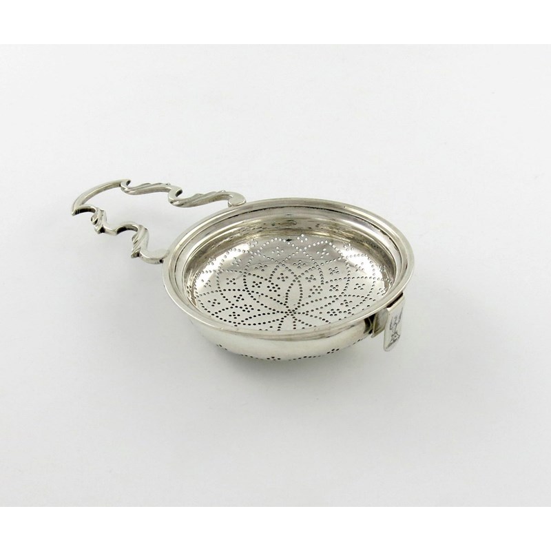 circular form, with one scroll side handle, the circular bowl with pierced decoration, and with a crested clip, length 17.5cm, approx. weight 4.4oz.