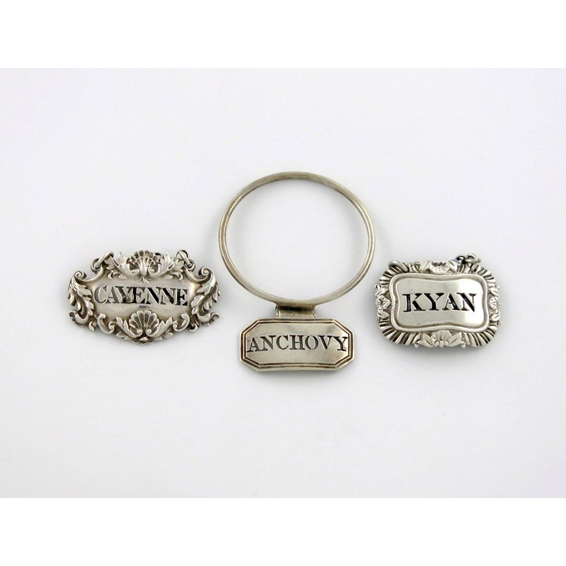 comprising: a rectangular neck ring, probably by Phipps and Robinson, London circa 1800, pierced 'ANCHOVY', plus one of shaped oval form, foliate and shell border, by Mary Ann and Charles Reily, London 1826, pierced 'CAYENNE', and one of rectangular form, foliate gadroon border, pierced 'KYAN', approx. total weight 0.6oz. (3)