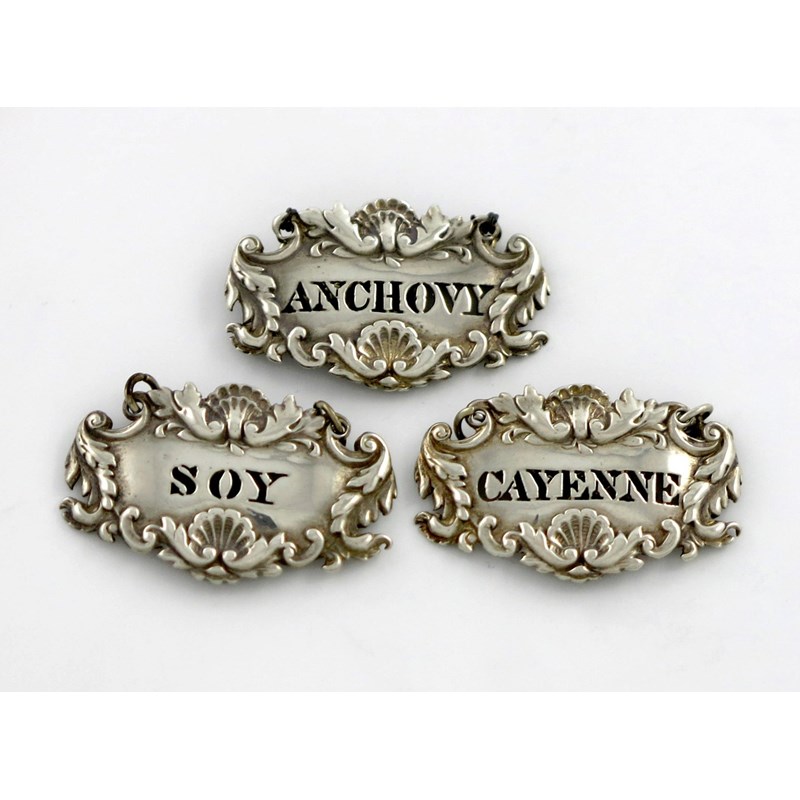 shaped oval form, foliate scroll borders, pierced 'ANCHOVY', 'CAYENNE', and 'SOY', length 3.4cm, approx. weight 0.4oz. (3)