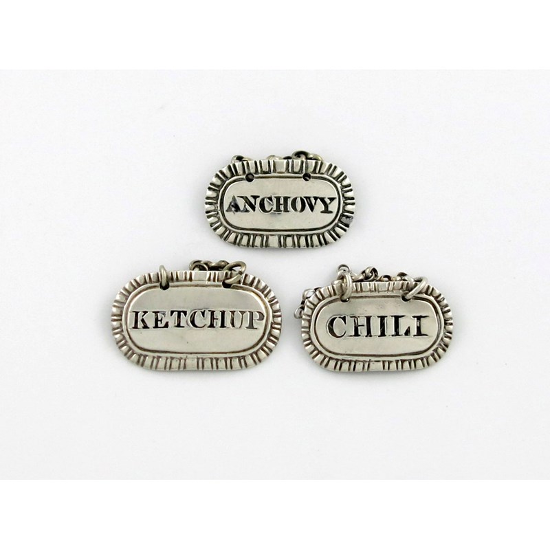 oblong form, gadroon border, pierced 'ANCHOVY', 'KETCHUP', and 'CHILI', approx. weight 0.20z. (3)