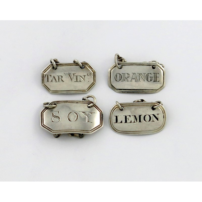 canted rectangular and oblong form, reeded border, comprising: 'TARn.VINgr', by George Knight, London 1818, one 'ORANGE', London 1805, plus 'SOY' and 'LEMON', approx. weight 0.4oz. (4)