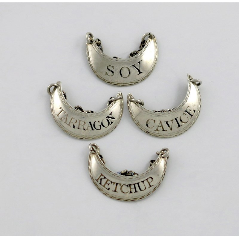 crescent form, incised 'CAVICE', 'TARRAGON', 'KETCHUP' 'SOY', with traces of blackening, approx. weight 0.3oz. (4)