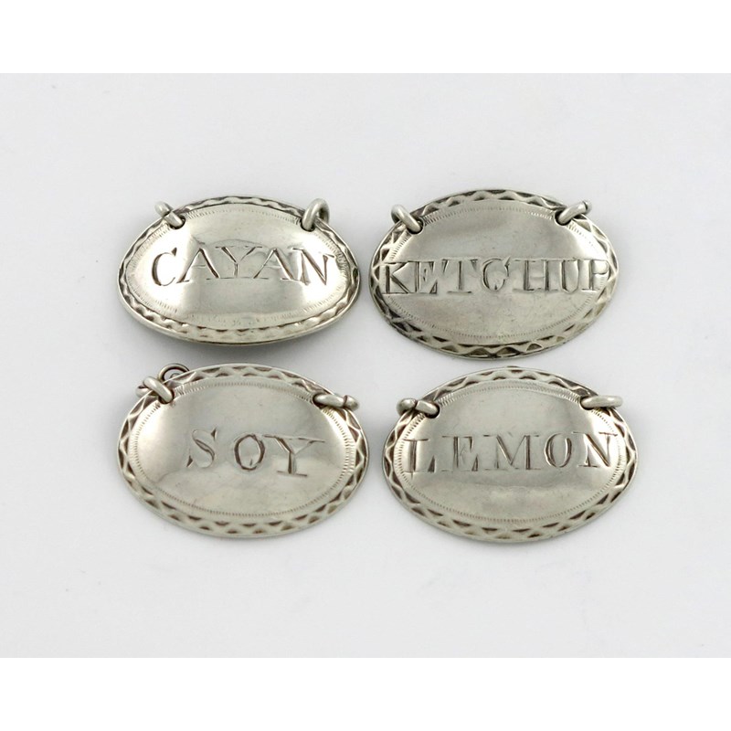 oval form, bright-cut borders, incised 'KETCHUP', 'SOY', 'LEMON' and 'CAYAN', length 2.5cm, approx. weight 0.4oz. (4)