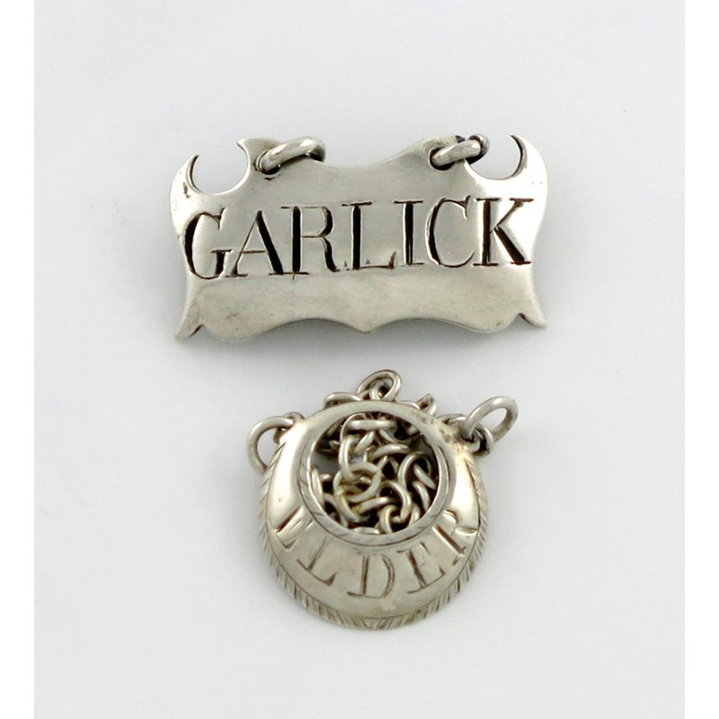shaped rectangular form, incised 'GARLICK', plus another 18th century silver sauce label, unmarked, crescent form, bright-cut border, incised 'ELDER', approx. weight 0.2oz. (2)