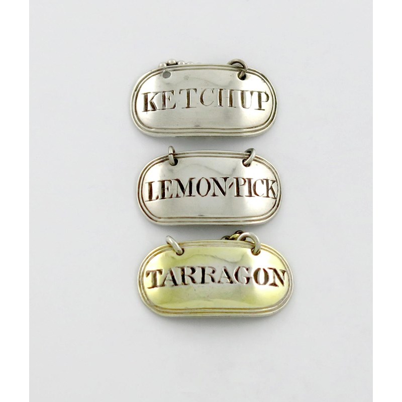 oblong form, reeded border, comprising: a silver-gilt one pierced 'TARRAGON', by John Robins, London 1804, and a pair London 1808, incised 'LEMON. PICK', and 'KETCHUP', approx. weight 0.3oz. (3)