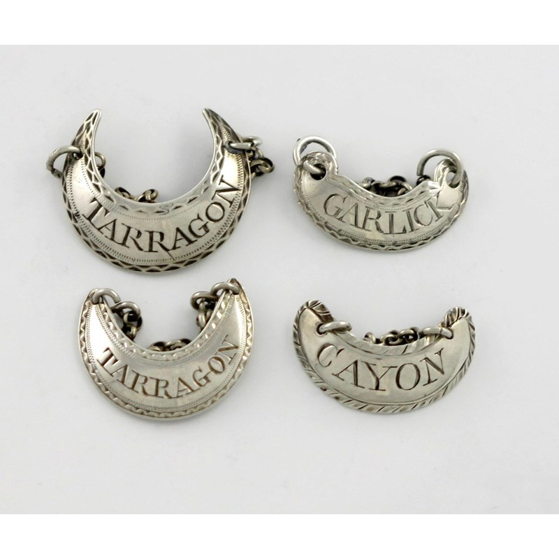 crescent form, bright-cut and feather-edge borders, one by Susannah Barker, London circa 1780, incised 'TARRAGON', one unmarked, incised 'CAYON', one by John Rich, incised 'TARRAGON', and another unmarked, incised 'GARLICk', approx. weight 0.4oz. (4)