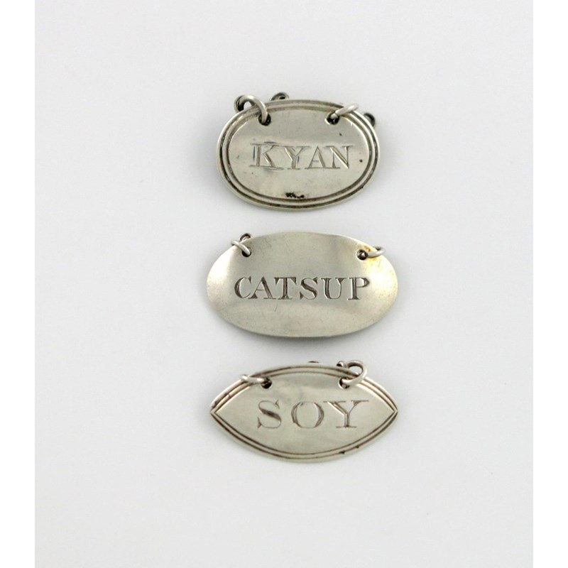 comprising: a George III oval label, possibly by John Baddeley, London 1821, incised 'CATSUP', one by John Holloway, London 1797, incised 'SOY', and one incised 'KYAN', approx. weight 0.4oz. (3)