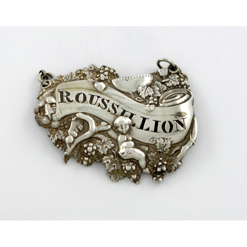 shaped form, with a Bacchanalian cherub, a leopard head, urn and trailing grape vines, pierced 'ROUSSILLION', length 6.2cm, approx. weight 0.6oz.