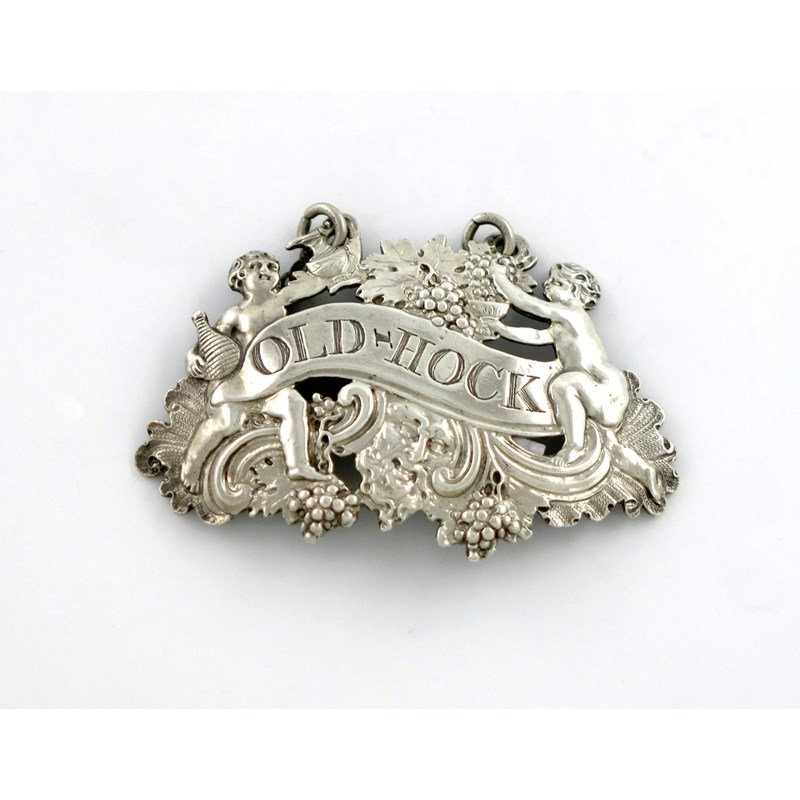 shaped form, with Bacchanalian cherubs with a jug and bottle and trailing grapevines, incised 'OLD HOCK', length 6.2cm, approx. weight 0.5oz.