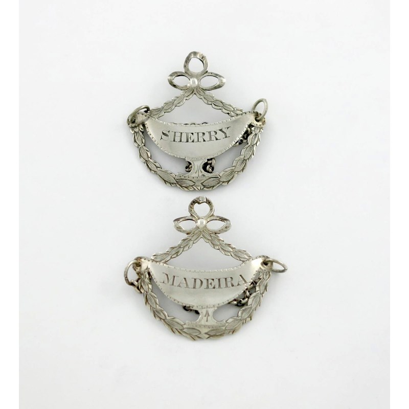 urn form, with pierced ribbon-tied festoons, bright-cut borders, incised 'SHERRY' and 'MADEIRA', length 5cm, approx. weight 0.7oz. (2)