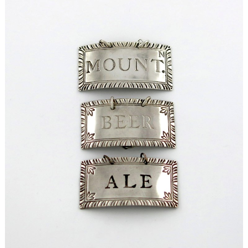rectangular form, feather-edge border, one incised and blackened 'ALE', the others incised 'BEER' and 'MOUNT.N', length 5.2cm. (3)