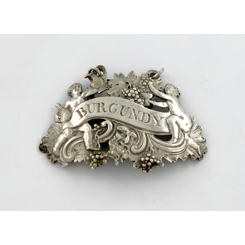 shaped form, with Bacchanalian cherubs with a jug and bottle and trailing grapevines, incised 'BURGUNDY', length 6.1cm, approx. weight 0.5oz.