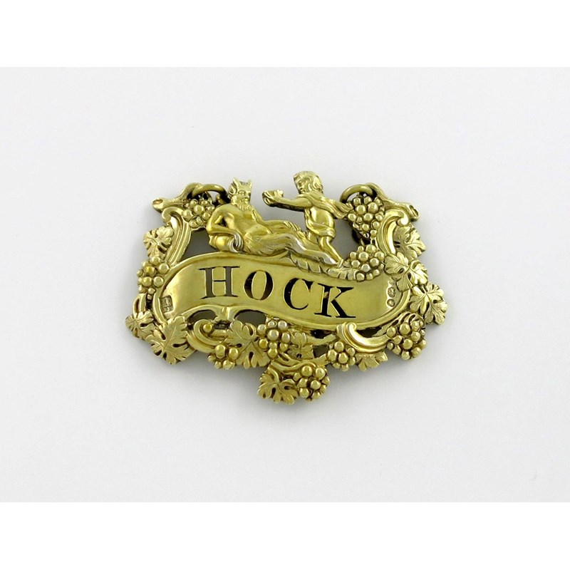 shaped form, with a putto passing a cup of wine to Bacchus, with trailing grapevines and bunches of grapes, pierced 'HOCK', length 6.2cm, approx. weight 1.1oz.