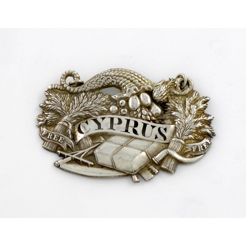 stamped out with sheaves of wheat, a cornucopia of fruit, a scythe, rake, sickle and a bale of wool and the word 'FREE' on each side, pierced 'CYPRUS', length 5.7cm, approx. weight 0.3oz.
