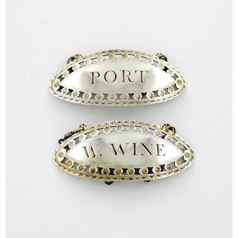 oval form, pierced and engraved decoration, incised 'PORT' and 'WINE', length 6cm, approx. weight 0.5oz. (2)