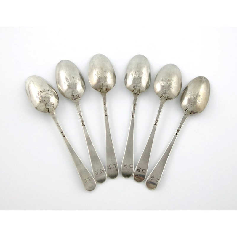 A set of six George III silver 'picture-back' Hanoverian pattern teaspoons