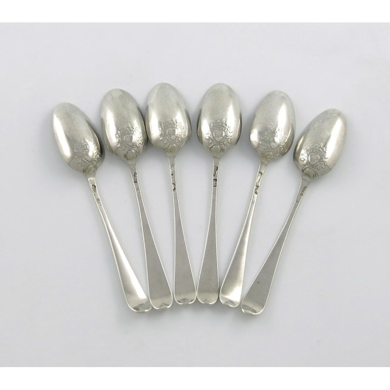 A set of six George III silver 'picture-back' Old English pattern teaspoons
