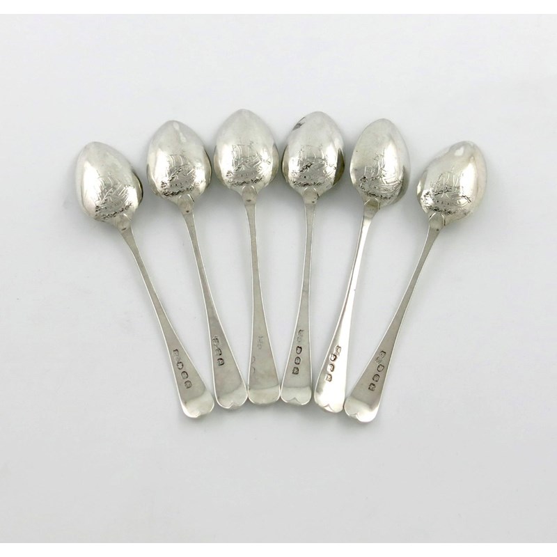A set of six George III silver 'picture-back' Old English pattern teaspoons