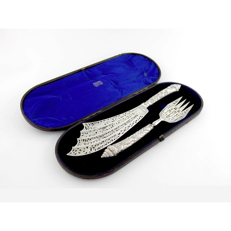 the scimitar shaped blade pierced and engraved with various fish amongst reeds, the handles with fish and shells, in a fitted case, length of knife 36.5cm.
