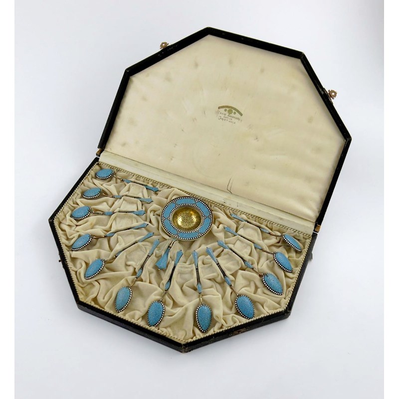 with blue enamel decoration with white beaded borders, in a fitted case, approx. weight 5.9oz.