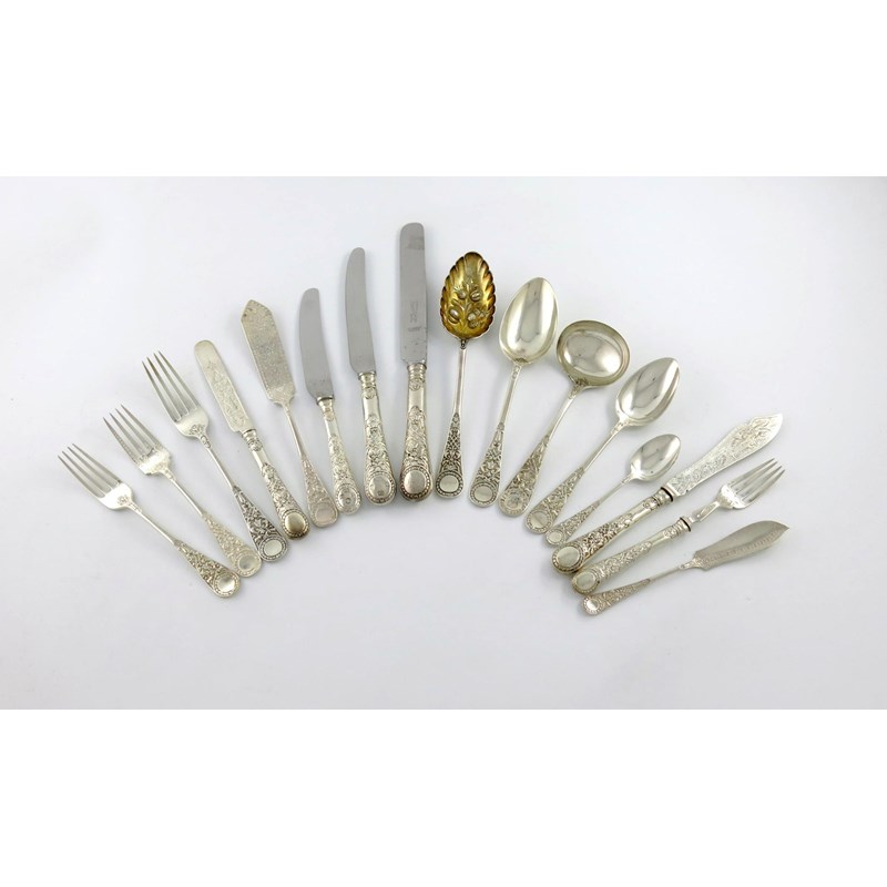 some with crests and initials, comprising: twelve table forks, twelve tablespoons, six dessert forks, six dessert spoons, six fish knives, six fish forks, twelve teaspoons, a cased pair of grape scissors, a pair of berry spoons, a sauce ladle, a pair of butter knives, a cased set of eleven teaspoons, tongs and caddy spoon, a cased set of six teaspoons and tongs, six fruit knives and forks, (filled handles), six fish knives and forks, (filled handles), six table knives, plus twelve modern table knives and twelve dessert knives, by Arthur Holder, approx. weighable 135oz. (qty)