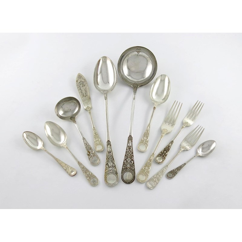 A collection of electroplated Venetian pattern flatware