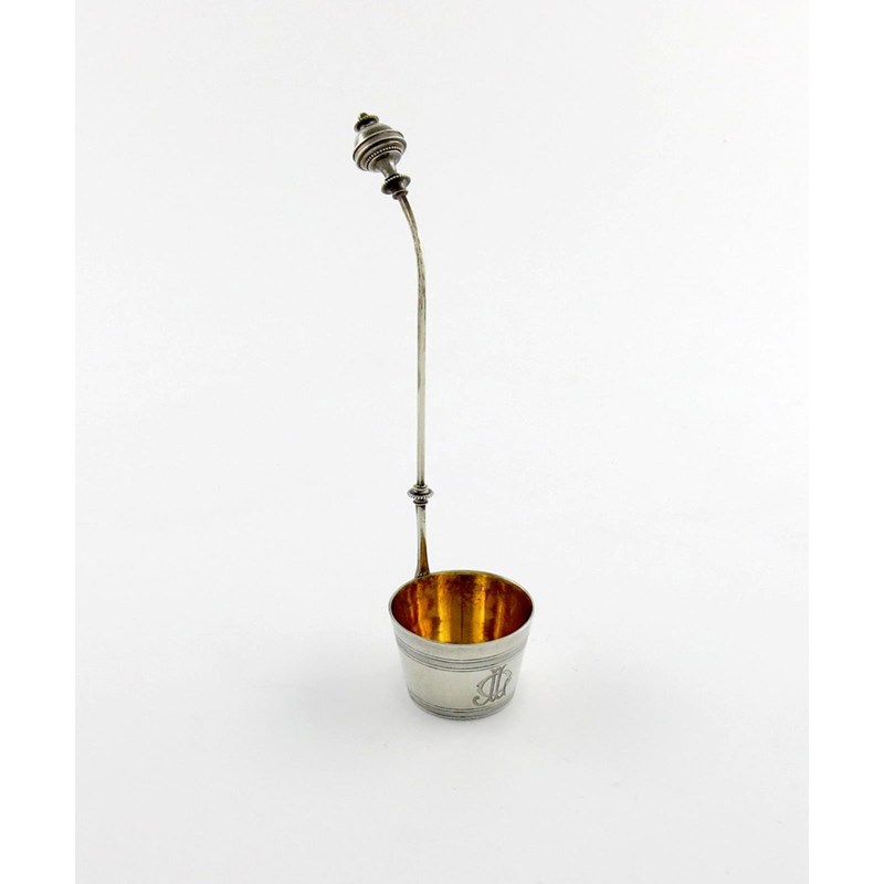tapering tub shaped bowl, the handle with a baluster handle and beaded borders, gilded interior of bowl, initialled, length 18.5cm, approx. weight 1.4oz.