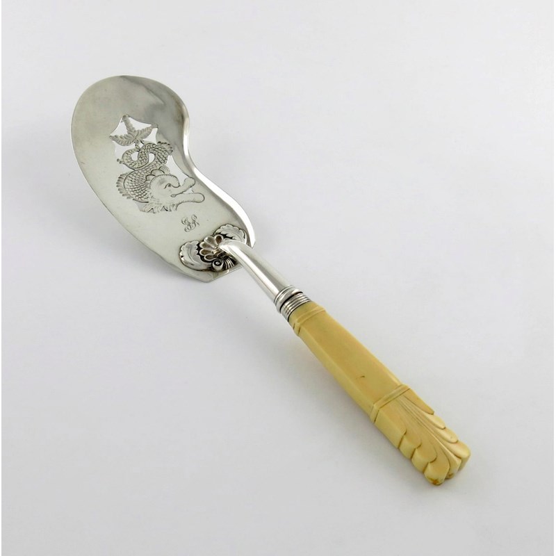 the shaped oval form, the blade pierced and engraved with a mythical dolphin, carved ivory handle, length 32.4cm.