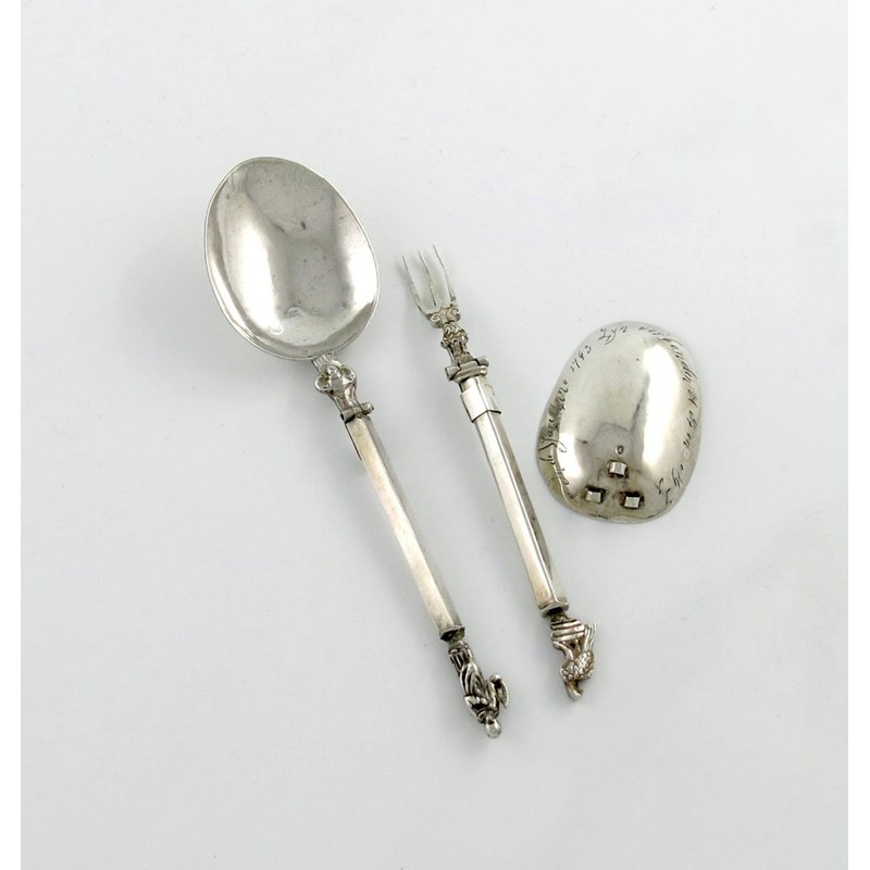 tapering square handle, with a bird finial, the pull-off bowl reveals the three tines of the fork, inscribed to bowl, plus another similar spoon, with an apostle finial, length 19.5cm and 19.3cm, approx. weight 3.9oz. (2)