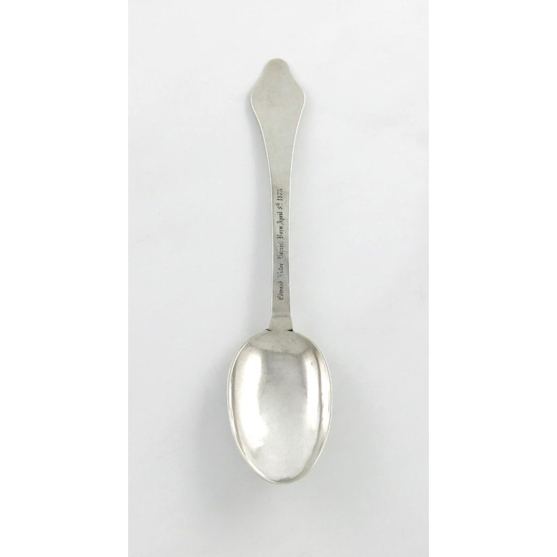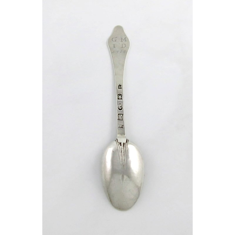 the oval bowl with a beaded rat-tail, the reverse of the elongated dog-nose finial prick-dot initialled 'GM' over 'ID' and dated '1711', the front of the stem later inscribed 'Edward Victor Harris, Born April 8th,1875', length 21cm, approx. weight 1.6oz.
