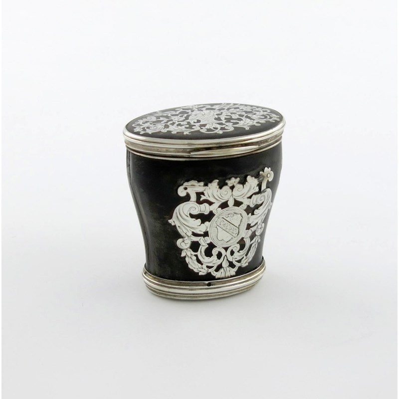waisted tapering oval form, the front and back with an inlaid foliate scroll cage-work cartouche, engraved with an armorial, the hinged cover inlaid with birds and foliate scroll decoration, height 5cm.