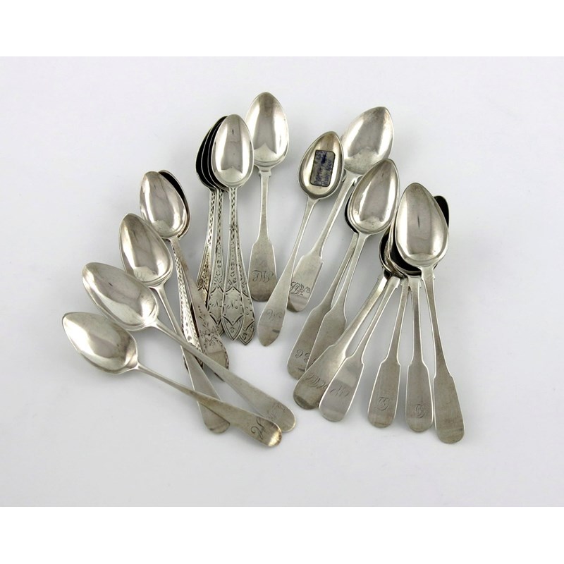 including: a set of four Bright-cut Celtic-point teaspoons, by Edward Livingstone, Dundee circa 1790, plus four Dundee Fiddle pattern teaspoons, two Aberdeen teaspoons by George Sangster and James Smith, an Inverness teaspoon by Charles Jamieson, one by Thomas Stewart of Elgin, one by Robert Keay of Perth, one by Thomas Shannon of Dundee, one by Joseph Pearson of Dumfries, one from Greenock, and three others, approx. weight 8.2oz. (19)