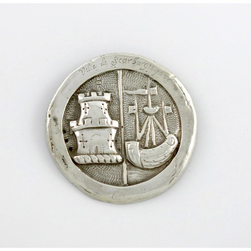 circular form, embossed with a representation of the seal of Scarborough, divided vertically in two, a tower on the left, a lymphad on the right, inscribed 'Ville de Scarburgte (sic)1688', the reverse with two ring attachments, diameter 8.5oz, approx. weight 1.3oz.