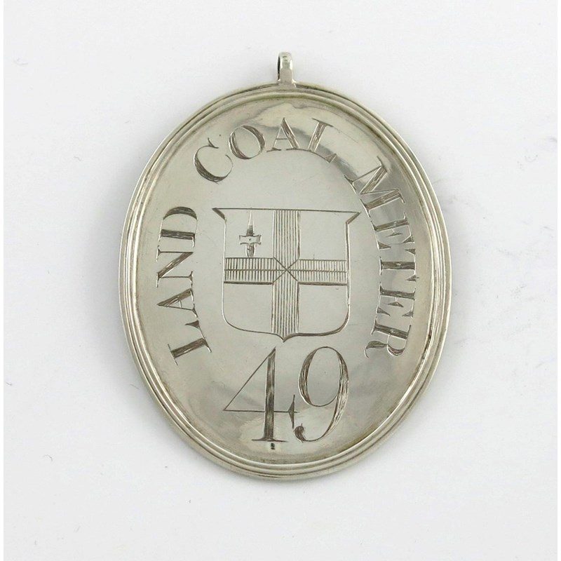 oval form, reeded border, engraved with the arms of the City of London, and inscribed 'LAND COAL METER' and '49', with a ring attachment, length 8.8cm, approx. weight 0.7oz.