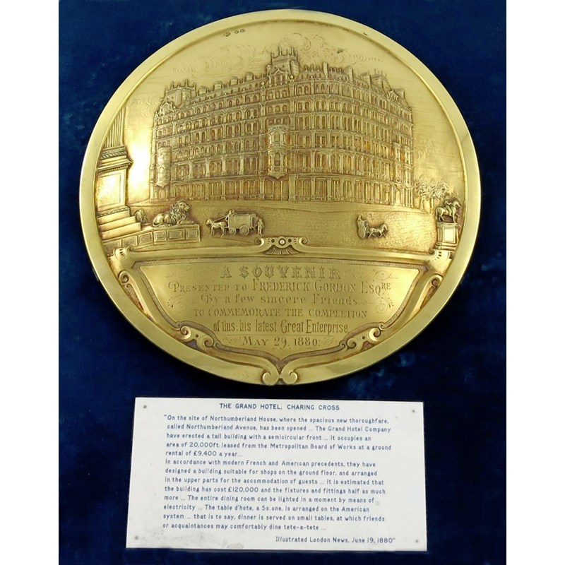 chased with a view of the Grand Hotel, Charing Cross, with the base of Nelson's Column to left and the statue of Charles I at Charing Cross to right, a carriage and hansom cab in foreground, inscribed 'A Souvenir presented to Frederick Gordon Esq.re by a few sincere friends to commemorate the completion of this; his latest Great Enterprise, May 29, 1880', mounted on a later blue velvet backed easel mount, diameter 24cm.