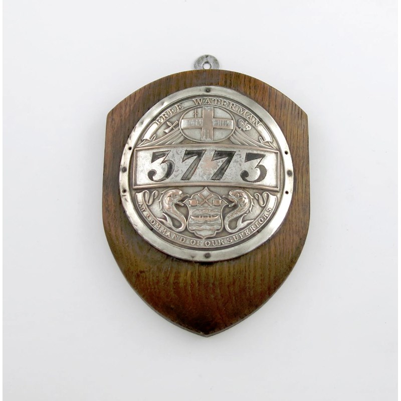 circular form, with the arms of the City of London and the Watermans' Company, numbered '3773' and stamped 'FREE WATERMAN, AT COMMAND OF OUR SUPERIORS', mounted on a wooden plaque, the reverse of plaque inscribed 1803-1837, total length 18cm.