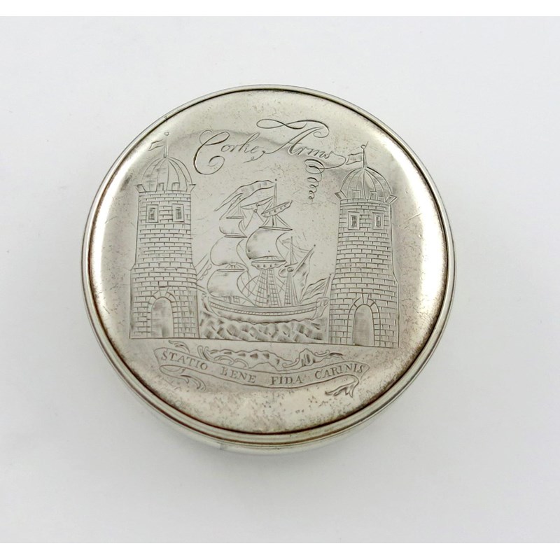circular form, the pull-off cover engraved with the arms and motto of the City of Cork, below 'Corke Arms', gilded interior, diameter 7.6cm, approx. weight 2.5oz.