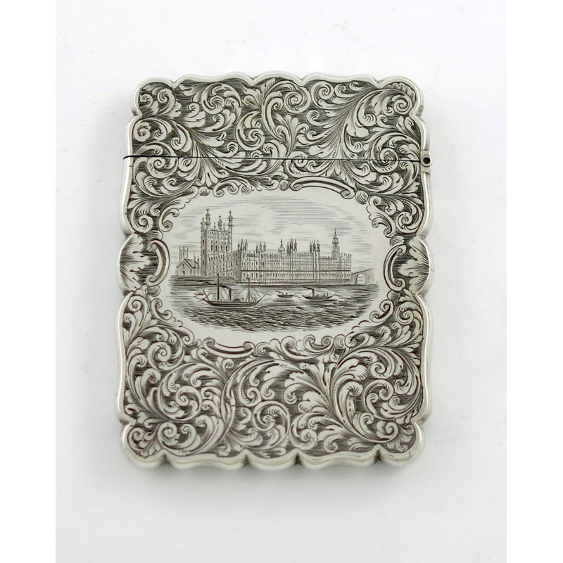 A Victorian silver engraved 'castle-top' card case, The Houses of Parliament,