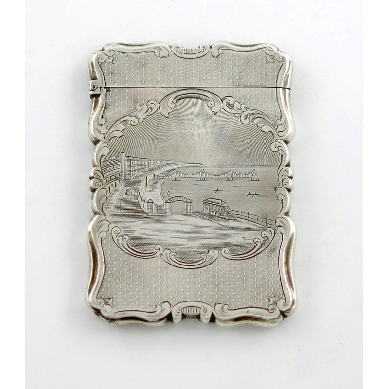 A Victorian silver engraved 'castle-top' card case, Brighton Old Chain Pier,