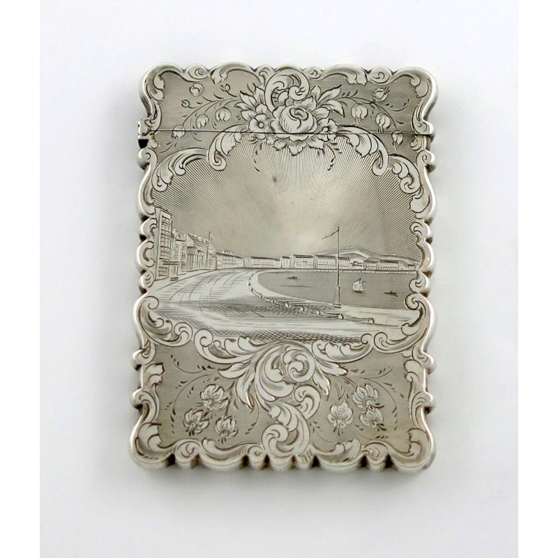 A Victorian silver engraved 'castle-top' card case, Aberystwyth sea front,