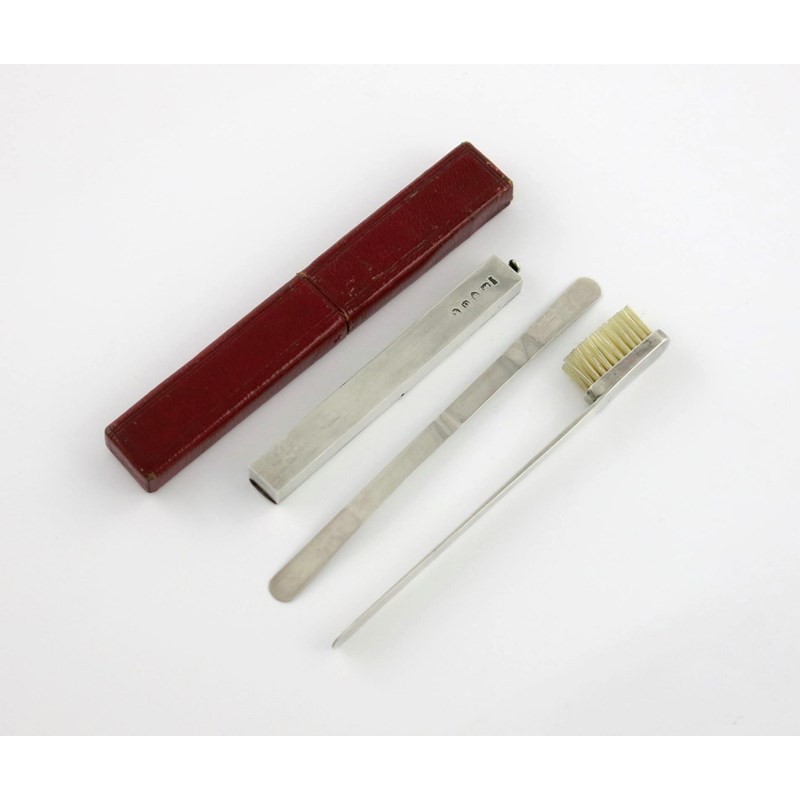 the box of rectangular form, with two hinged compartments, the toothbrush and scraper of plain form, in a fitted red case, length of box 9.2cm.