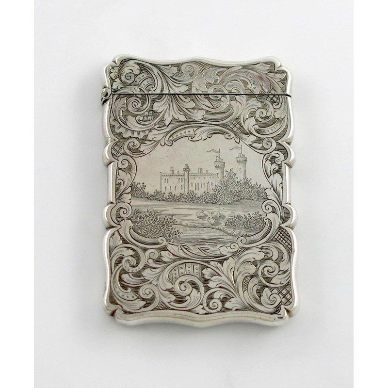 A Victorian silver engraved 'castle-top' card case, Warwick Castle,
