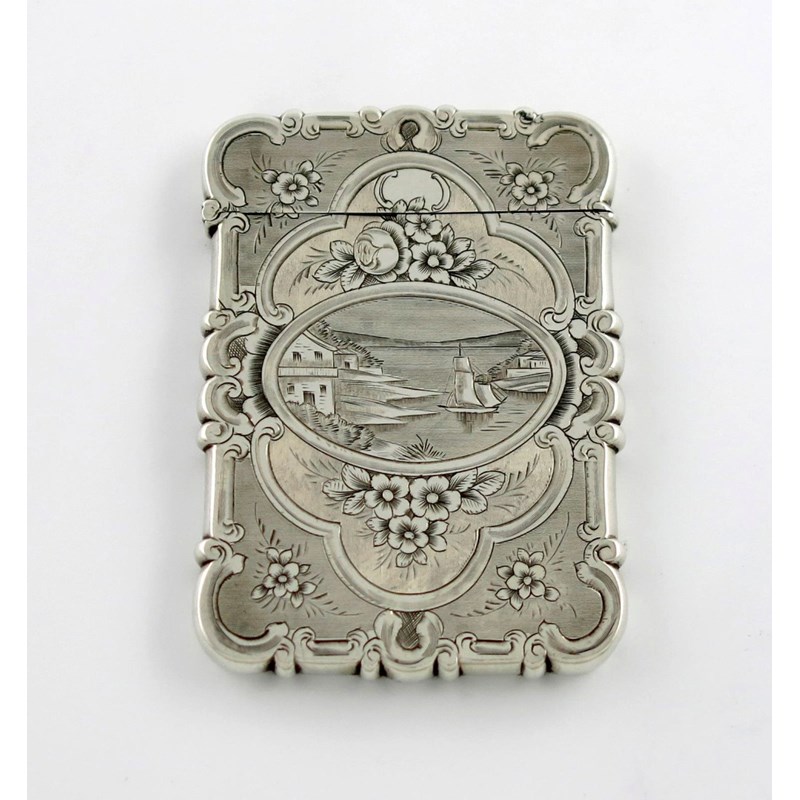 A Victorian silver engraved 'castle-top' card case, buildings by a lake,