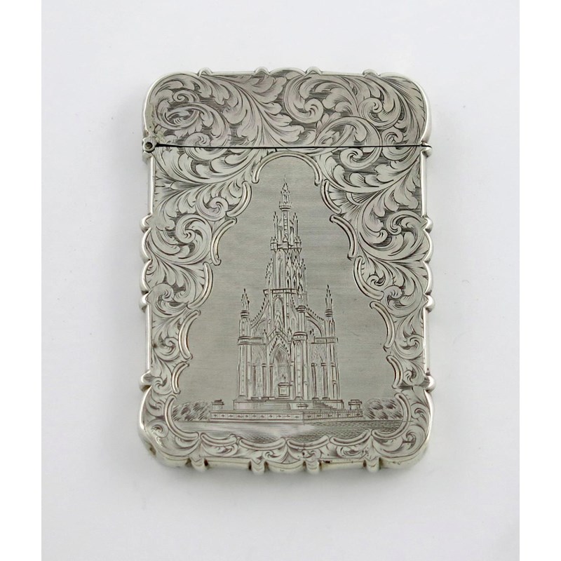 A Victorian silver engraved 'castle-top' card case, Scott Memorial,