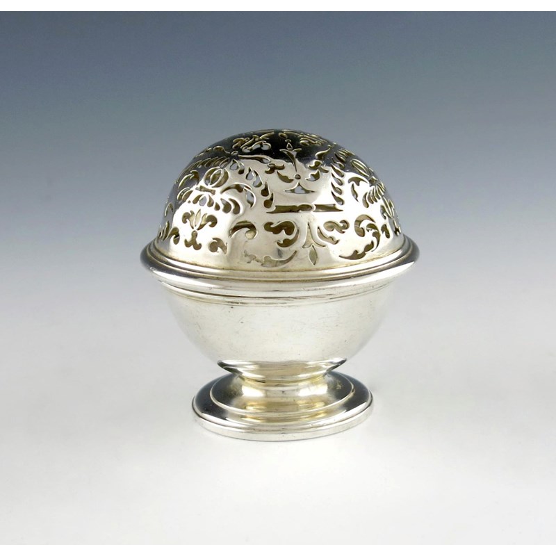 spherical form, the hinged cover with pierced decoration, on a raised circular foot, height 7.5cm, approx. weight 4.9oz.