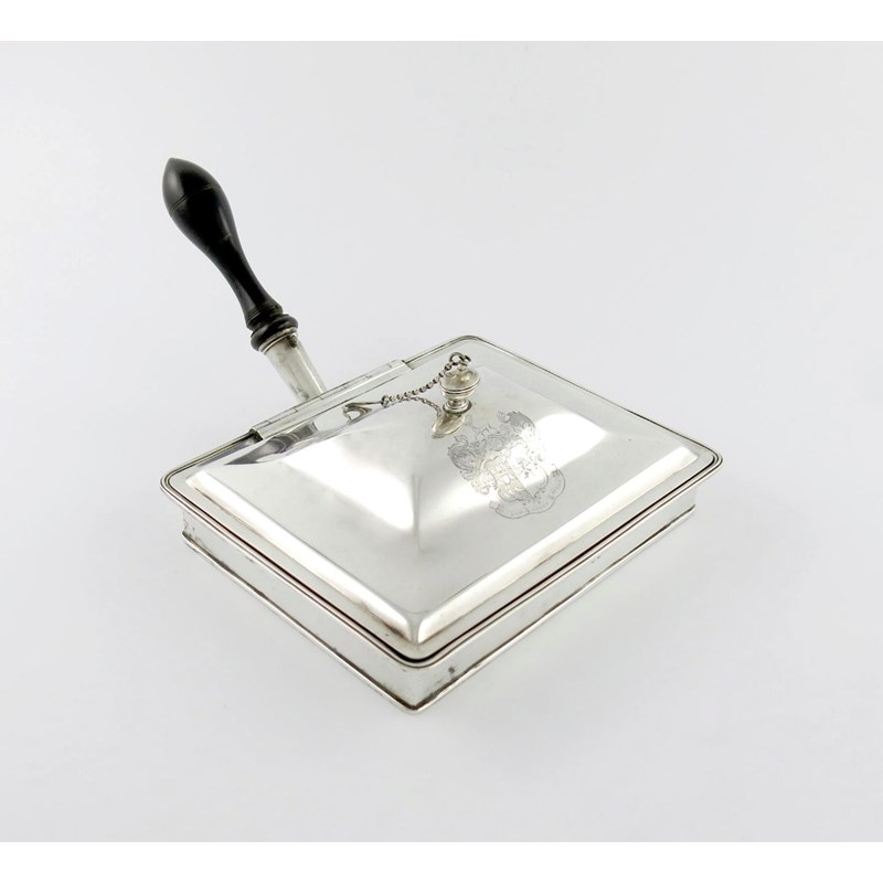 rectangular form, the raised hinged cover with an urn finial and engraved with an armorial, and with a chain and hook attachment, turned wooden baluster handle, the interior with six rectangular removable dishes, length 22cm, approx. weight 49oz.