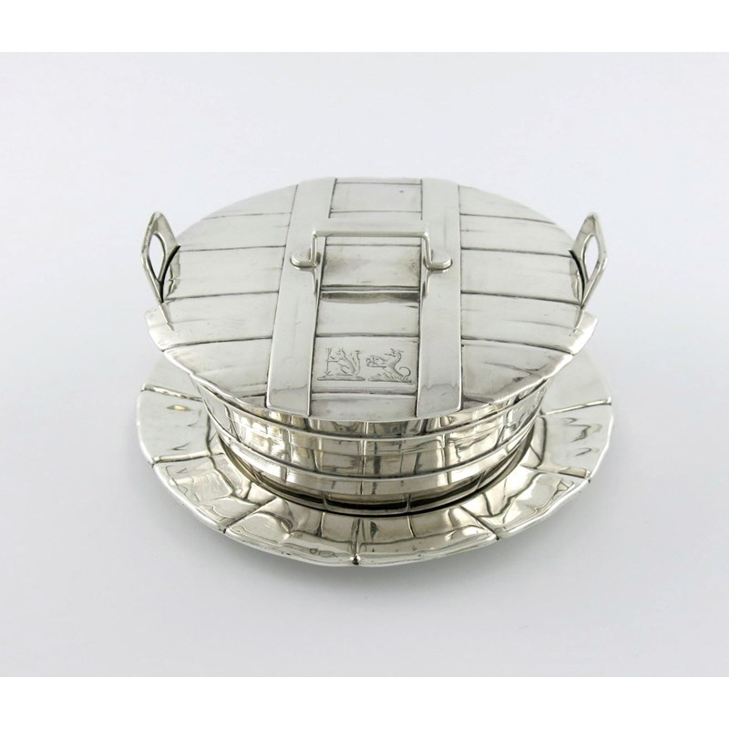 circular tapering form, coopered and banded decoration, with side handles, the pull-off cover with a crest, the base and stand engraved with a crest, diameter 16cm, diameter from base 17.8cm, approx. weight 31oz. (3)