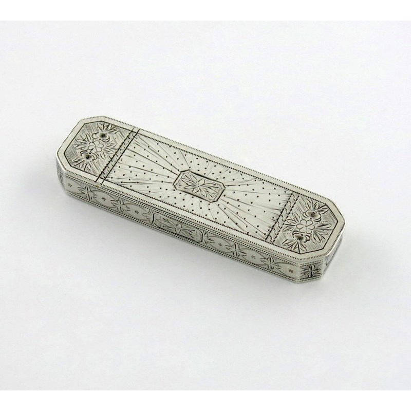rectangular form, canted corners, engraved radiating and foliate decoration, velvet lined, later loose mirror, length 8cm, approx. weight 0.9oz.