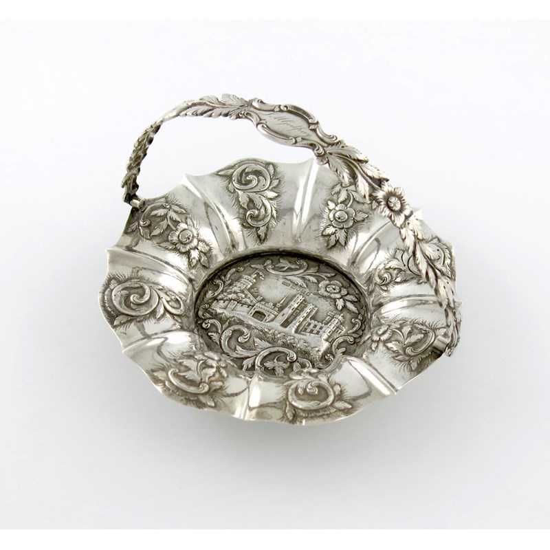 fluted circular form, the centre embossed with a scene of Windsor Castle, the swing-handle inscribed 'L.M. Godfray', diameter 14.2cm, approx. weight 4oz.