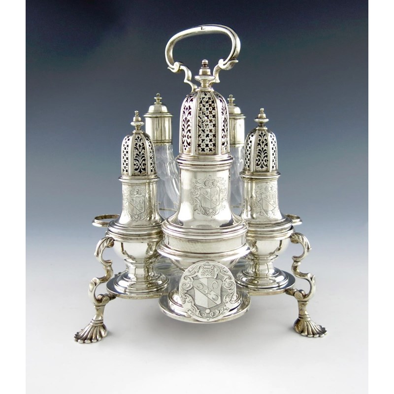 conventional cinquefoil form, wire-work frame, central carrying handle, on four scroll legs with webbed pad feet, applied with an oval cartouche engraved with an armorial, the underside with a scratch weight 25=13, with a large caster and two smaller casters, engraved with an armorial, and two unmarked silver-mounted glass bottles, height 25.5cm, approx. weighable 54oz.